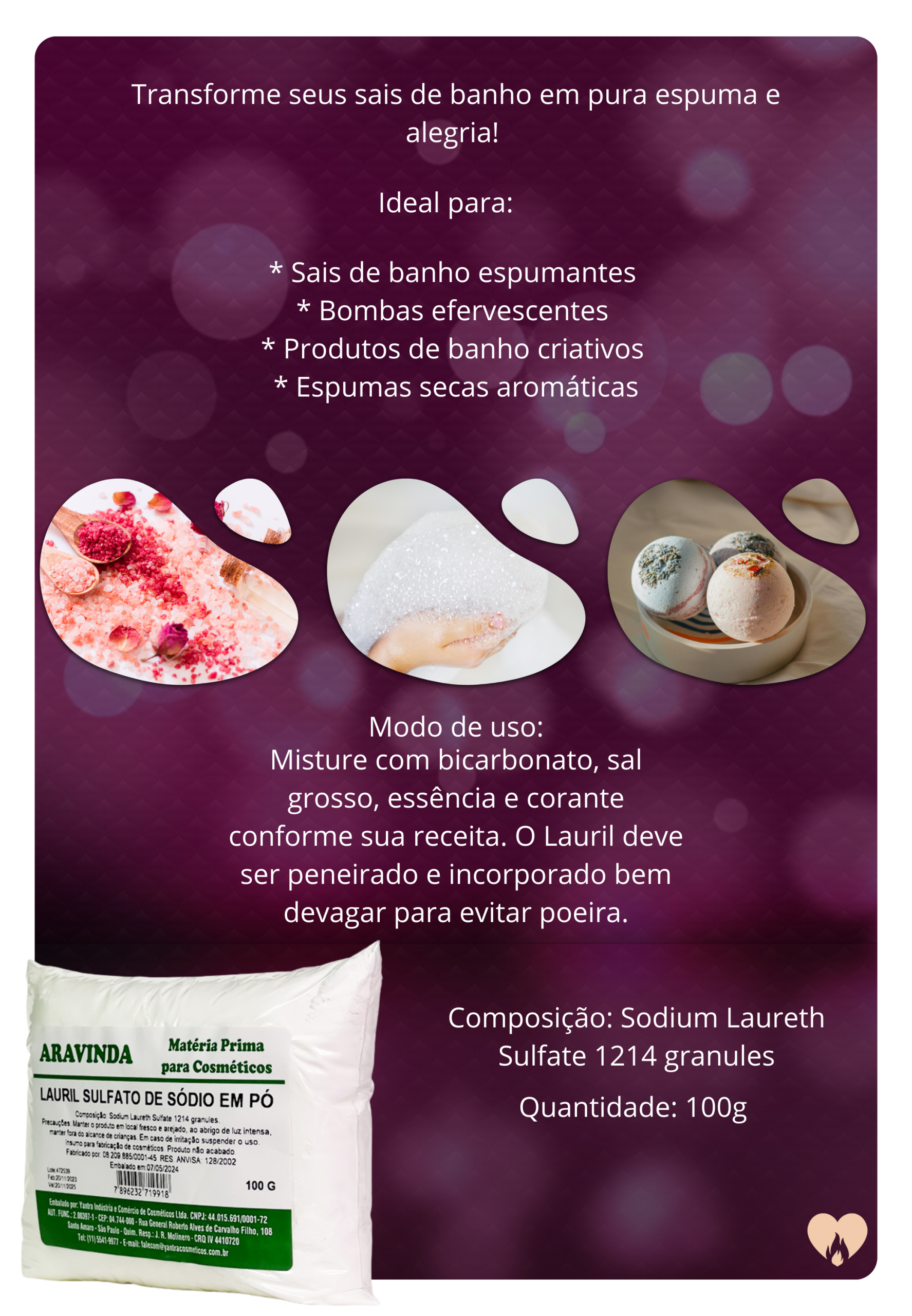 Misture com bicarbonato, sal grosso, essência e corante conforme sua receita. O Lauril deve ser
